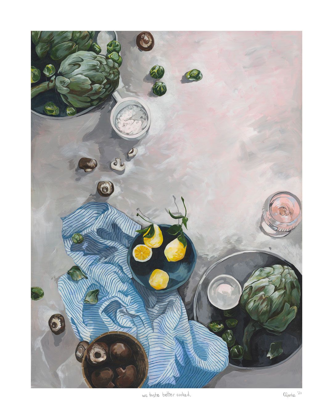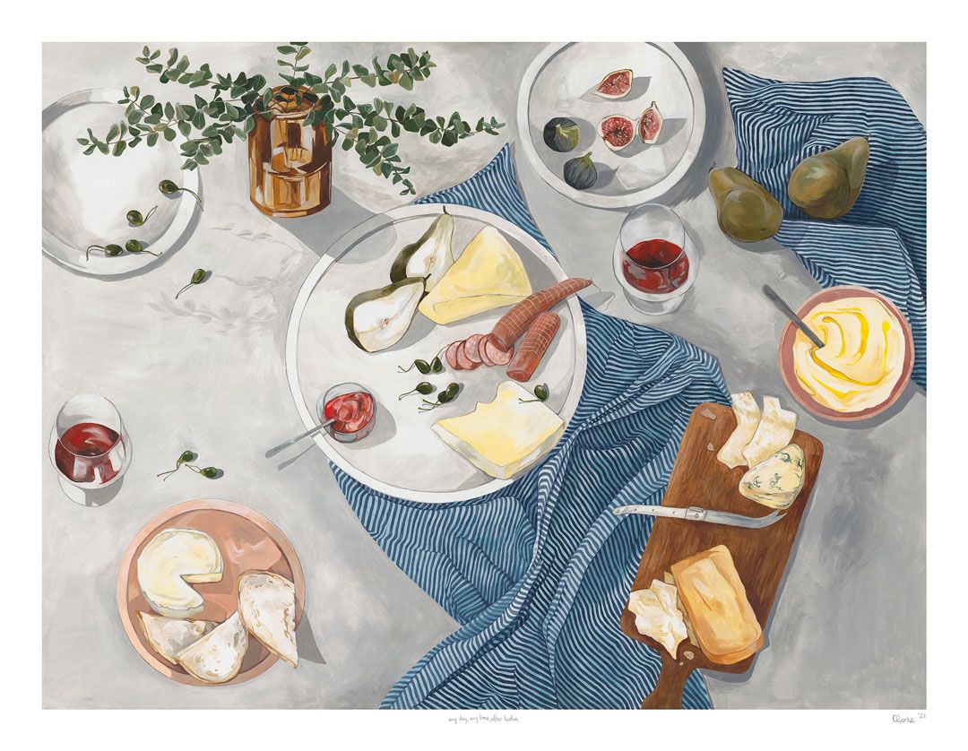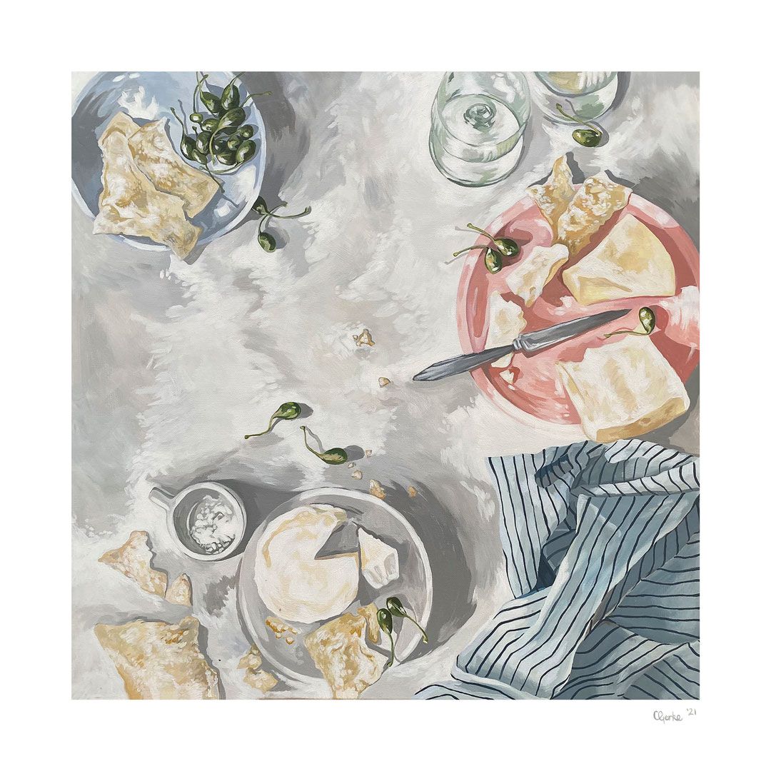 Food seems to be the obsession at the moment in my work—I'm sure this won’t always be the case! I am married to a very talented chef, so food is a constant source of conversation in our home. We watch food shows on the telly, subscribe to all the recipe magazines, and obviously we both love to eat! I haven’t always been obsessed with food, I would say the true obsession is with color. A few years ago I worked on predominately abstract works and was fascinated with light and shade. I have some plans for some future works in 2022 and I am actually going to be working on paper more, playing with charcoal and pencil—at least in the summer season when the paint dries out in a matter of minutes in the hot Byron summer!