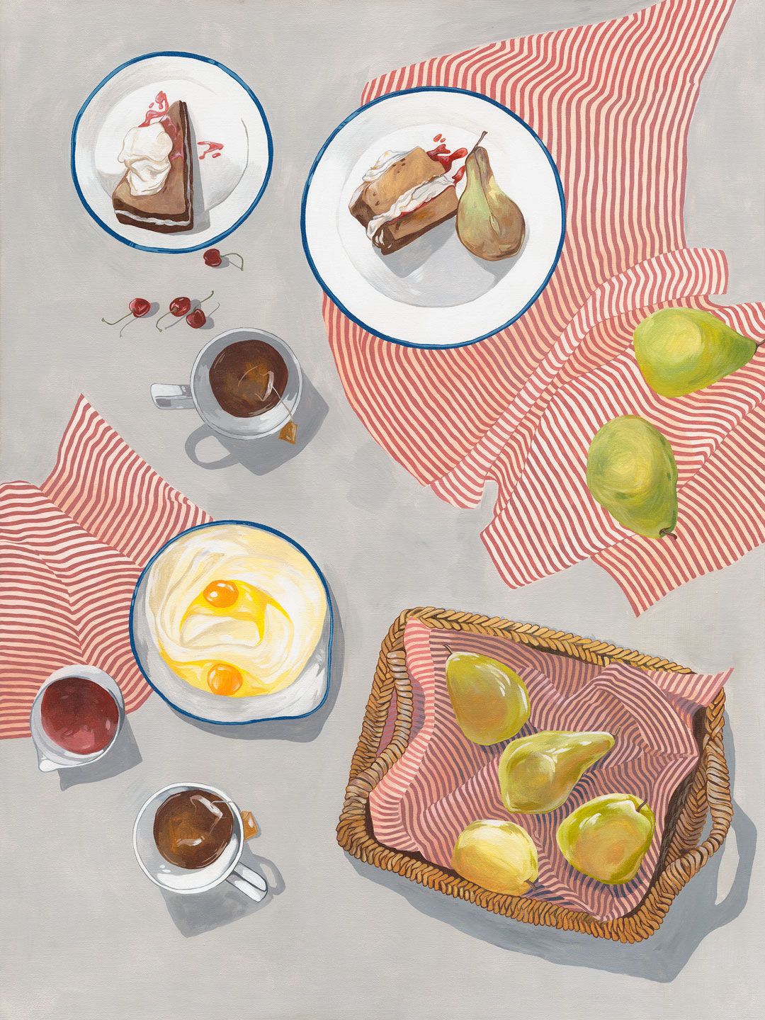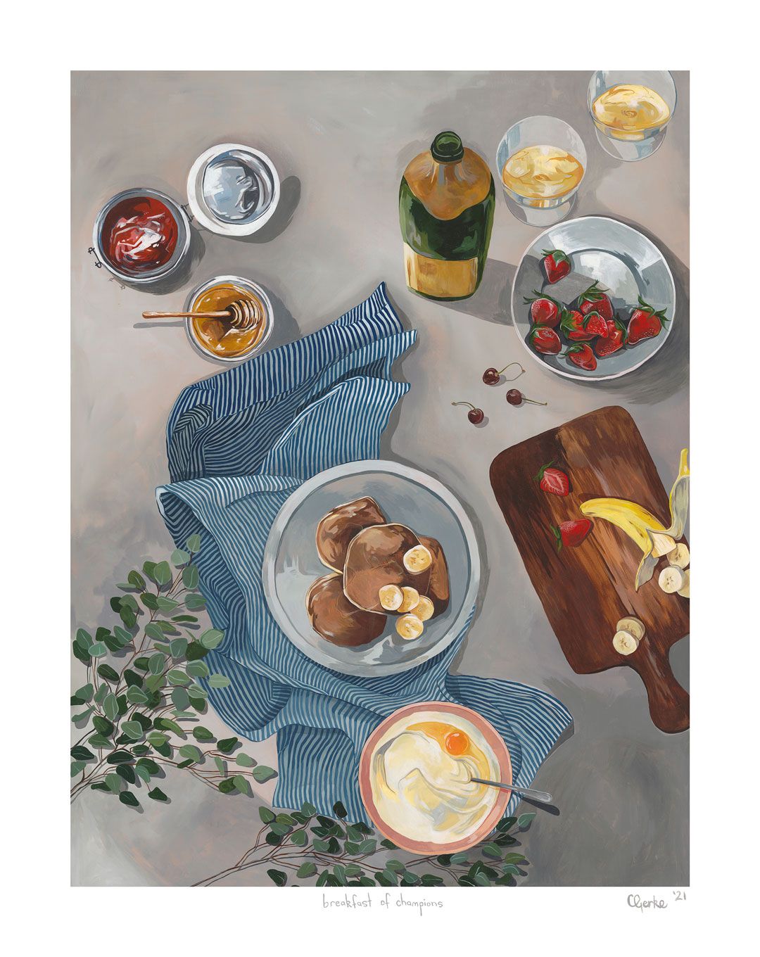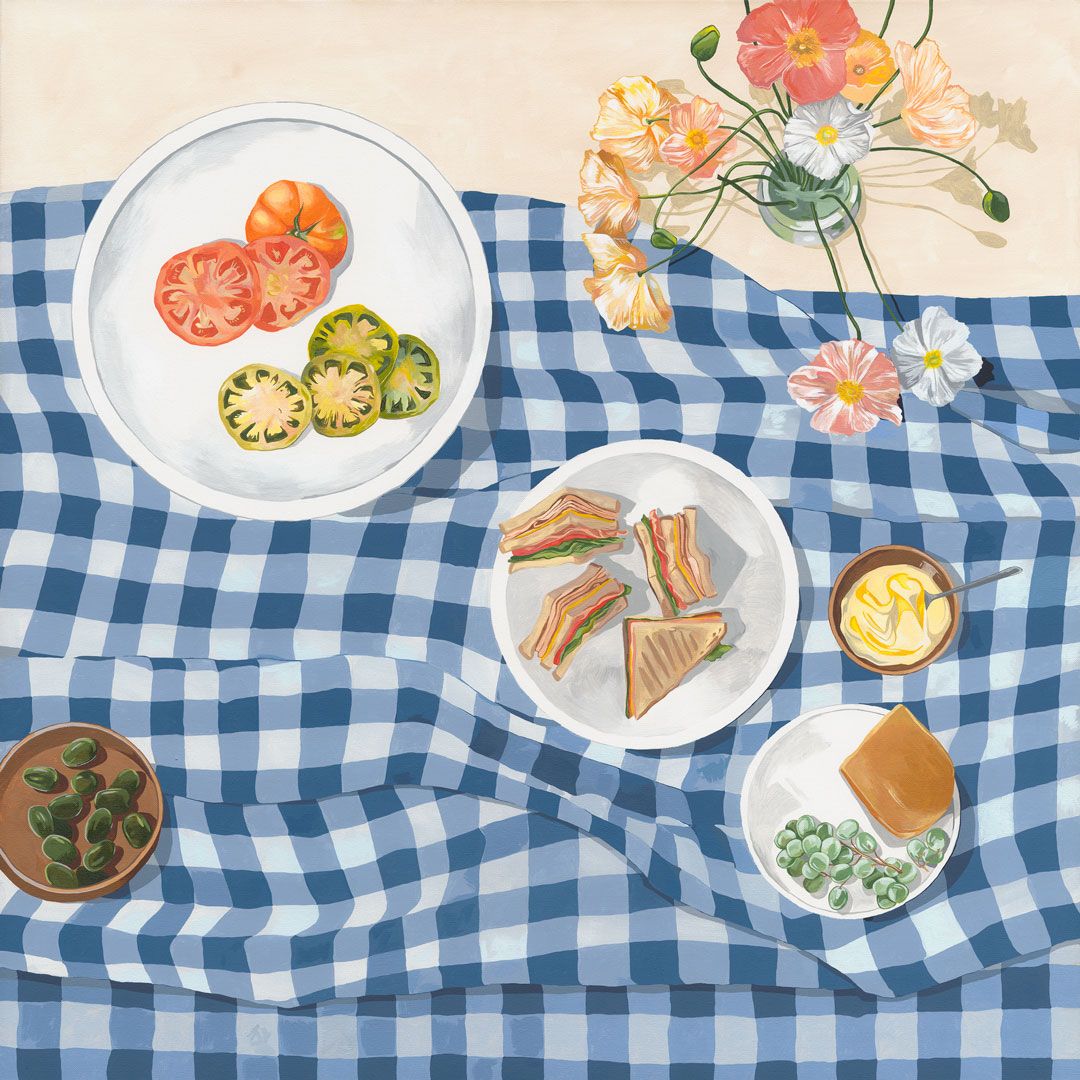 Food seems to be the obsession at the moment in my work—I'm sure this won’t always be the case! I am married to a very talented chef, so food is a constant source of conversation in our home. We watch food shows on the telly, subscribe to all the recipe magazines, and obviously we both love to eat! I haven’t always been obsessed with food, I would say the true obsession is with color. A few years ago I worked on predominately abstract works and was fascinated with light and shade. I have some plans for some future works in 2022 and I am actually going to be working on paper more, playing with charcoal and pencil—at least in the summer season when the paint dries out in a matter of minutes in the hot Byron summer!