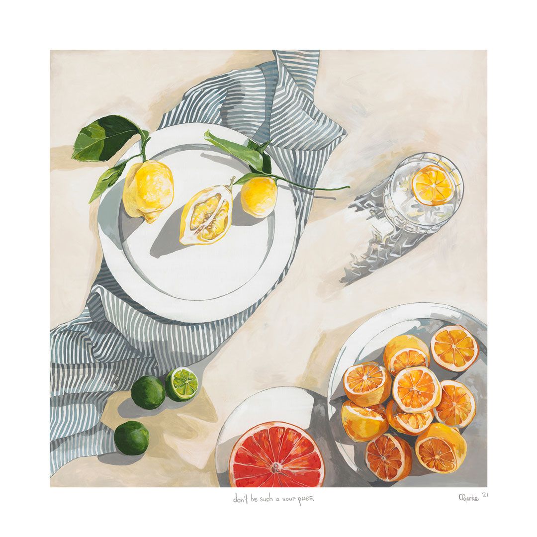 I have never met an artist, myself included, that is ever satisfied with a work entirely. Finished pieces are never really finished, simply abandoned. I could work and re-work a piece until the canvas in 5 inches thick with paint if I allowed myself too! The work that probably means the most to me, though, is a work I painted for my parents' home entitled “don’t be such a sour puss”. It was designed and painted to feature in the kitchen of their new home which they spent almost 6 years building. It meant a lot of have something of mine in the heart of their home.