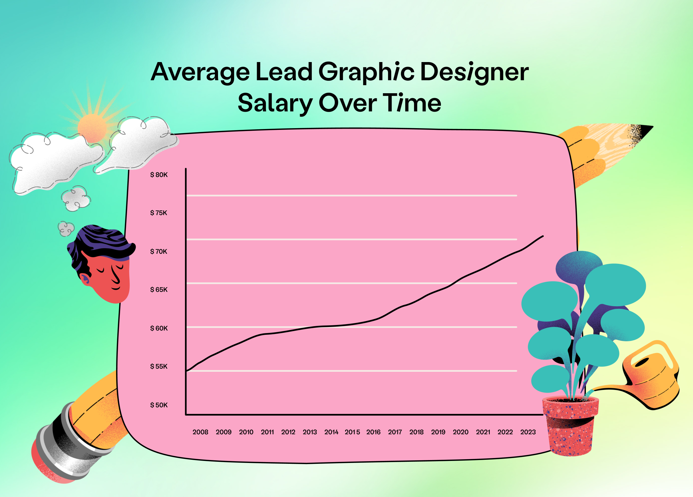 Besides salary differences based on location, lead graphic designer salaries also evolve over time. For instance, US salaries have increased by nearly 14% over the past five years.