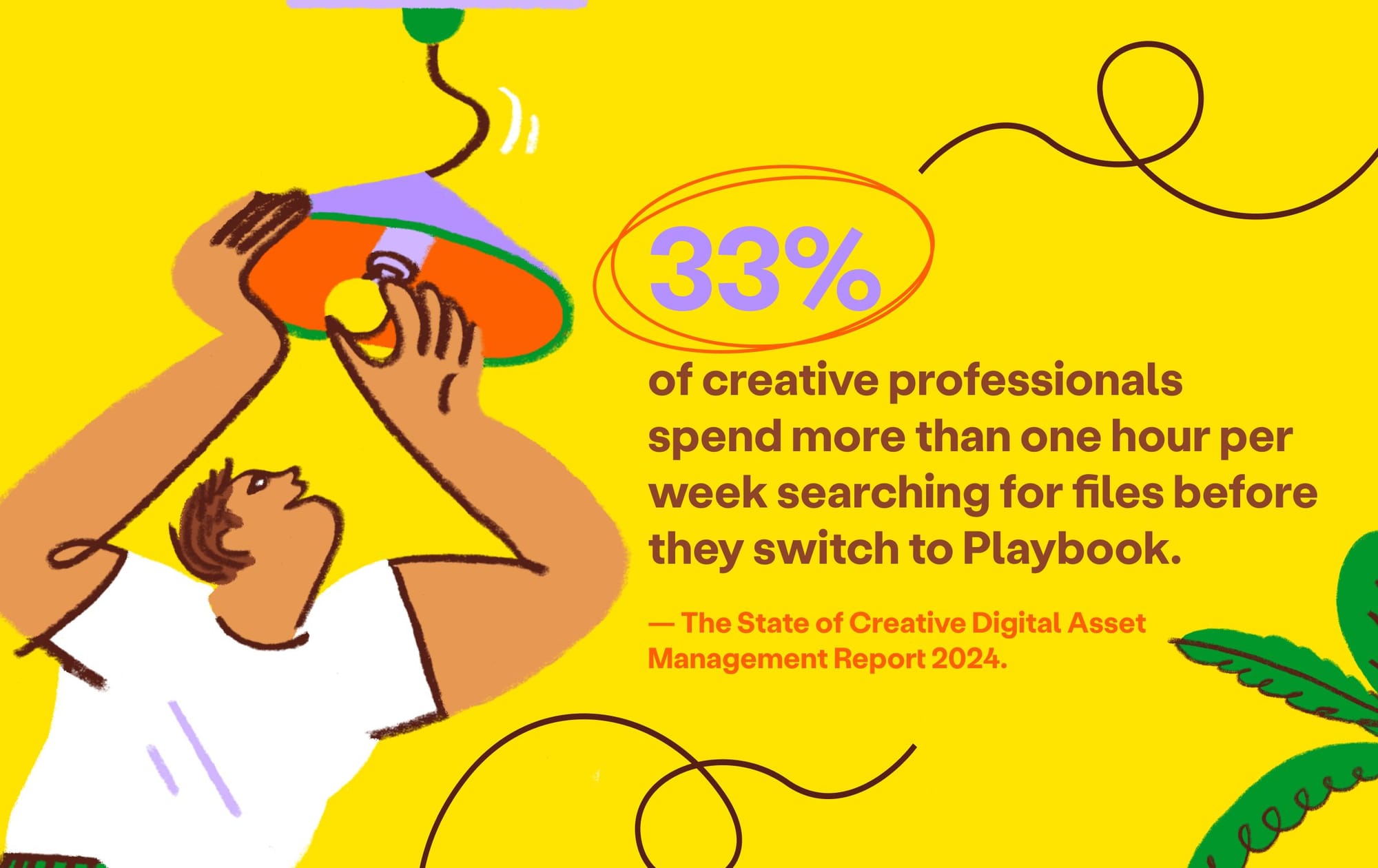 This may sound like a small issue, but the minutes spent looking for a particular creative asset can really add up. Our State of Creative Digital Asset Management Report 2024 found that 33% of creative professionals spend more than one hour per week searching for files before they switch to Playbook. That is one hour per week that could’ve been better spent creating beautiful on-brand designs, scroll-stopping videos, or impactful illustrations.