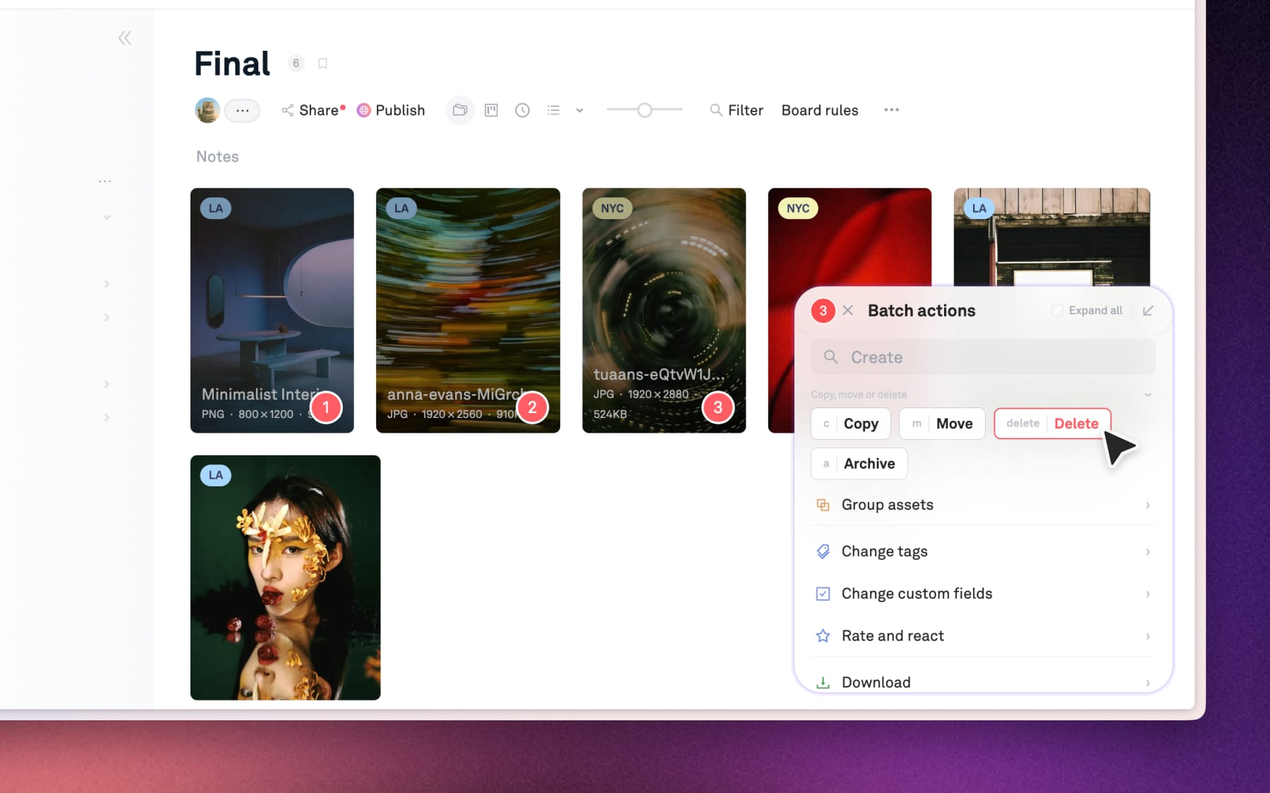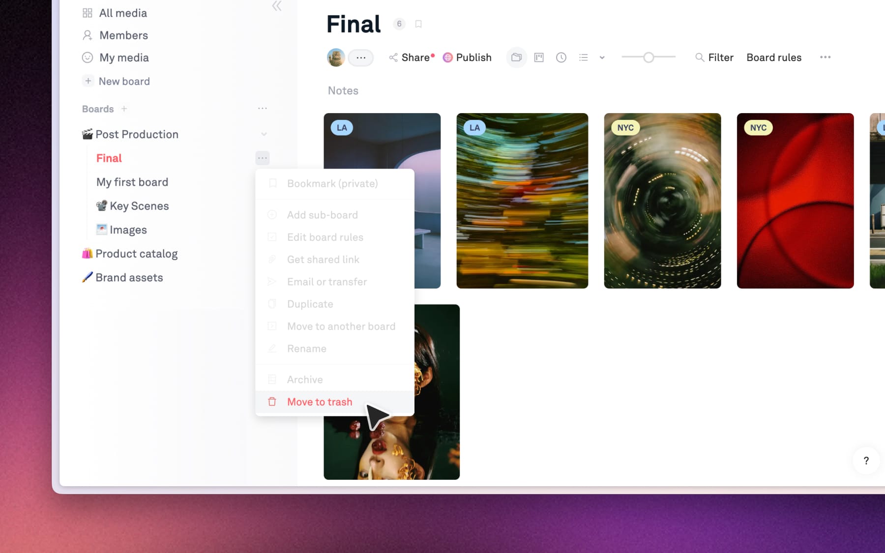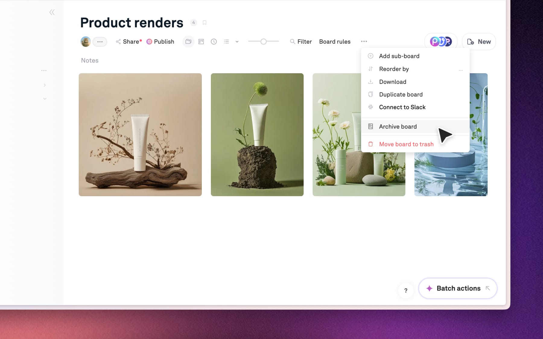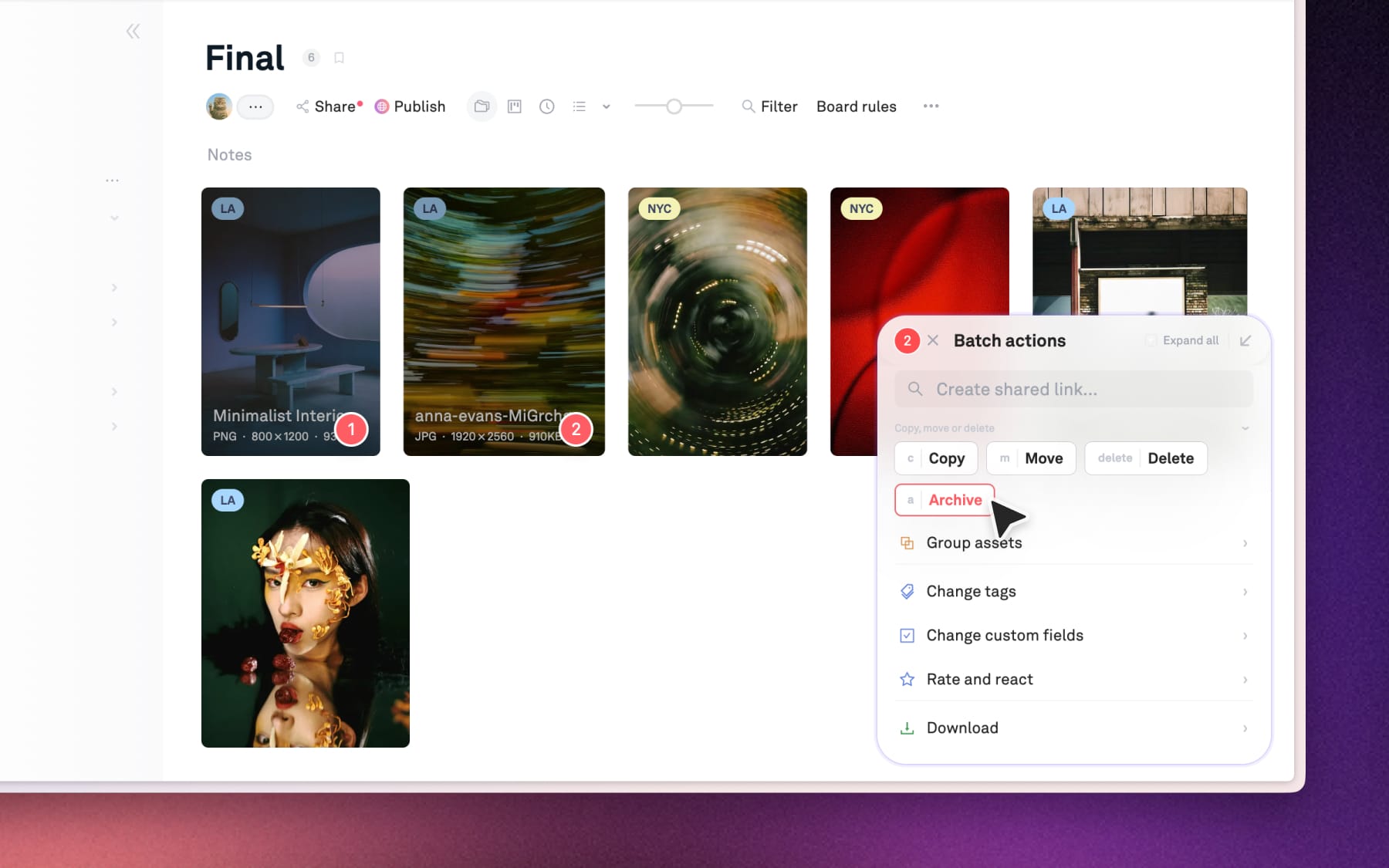 Archiving removes assets or entire boards from your active workspace but keeps them searchable, downloadable and easy to restore anytime.