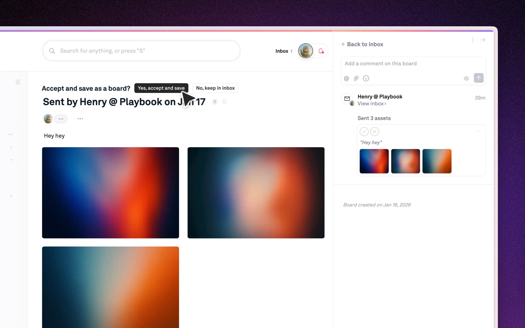- Open & confirm: While you're inside an Inbox board, use the buttons appear in the header to accept or ignore and keep it in Inbox.