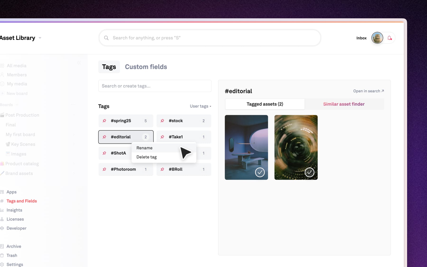 Click on the (•••) icon next to any tag and choose Rename or Delete from the dropdown. Changes apply across your entire workspace, including assets that already use that tag.