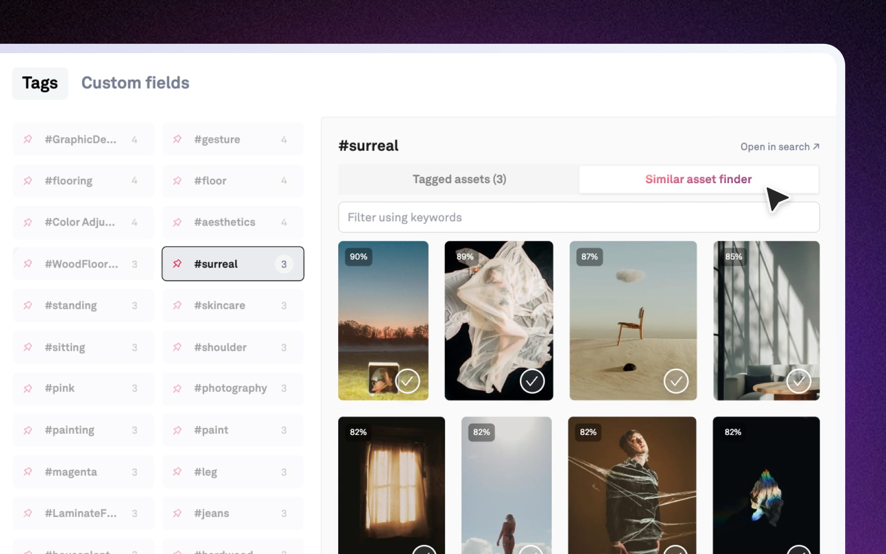 Click on any tag to view its assets. You’ll also see a Similar asset finder, which surfaces related assets across your workspace along with a similarity percentage.