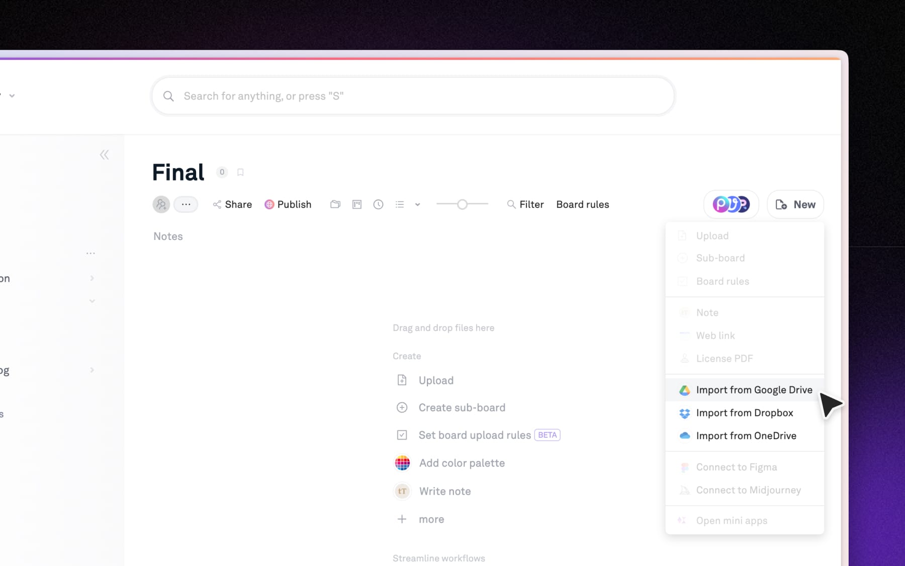If your files already live in Google Drive, Dropbox, or OneDrive, you don't need to manually download everything and re-upload it to Playbook. You can import files directly into a board so they're immediately visible, organized, and ready to work with.