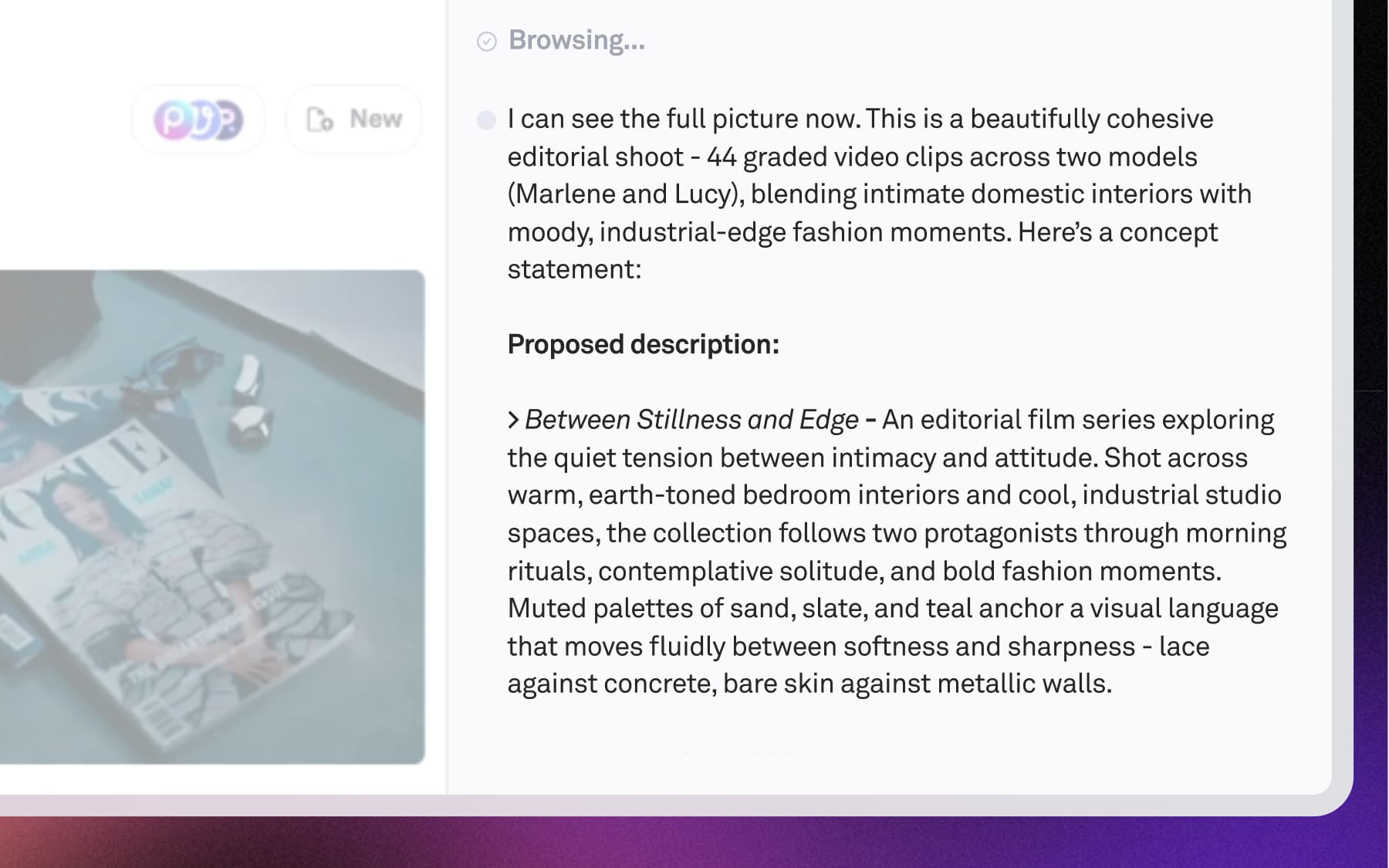 You can use chat to generate ideas and creative direction based on the actual content in your workspace. Instead of starting from scratch, Playbook looks at your visuals — any referenced collections, products, or past work — and helps you build on what’s already there.