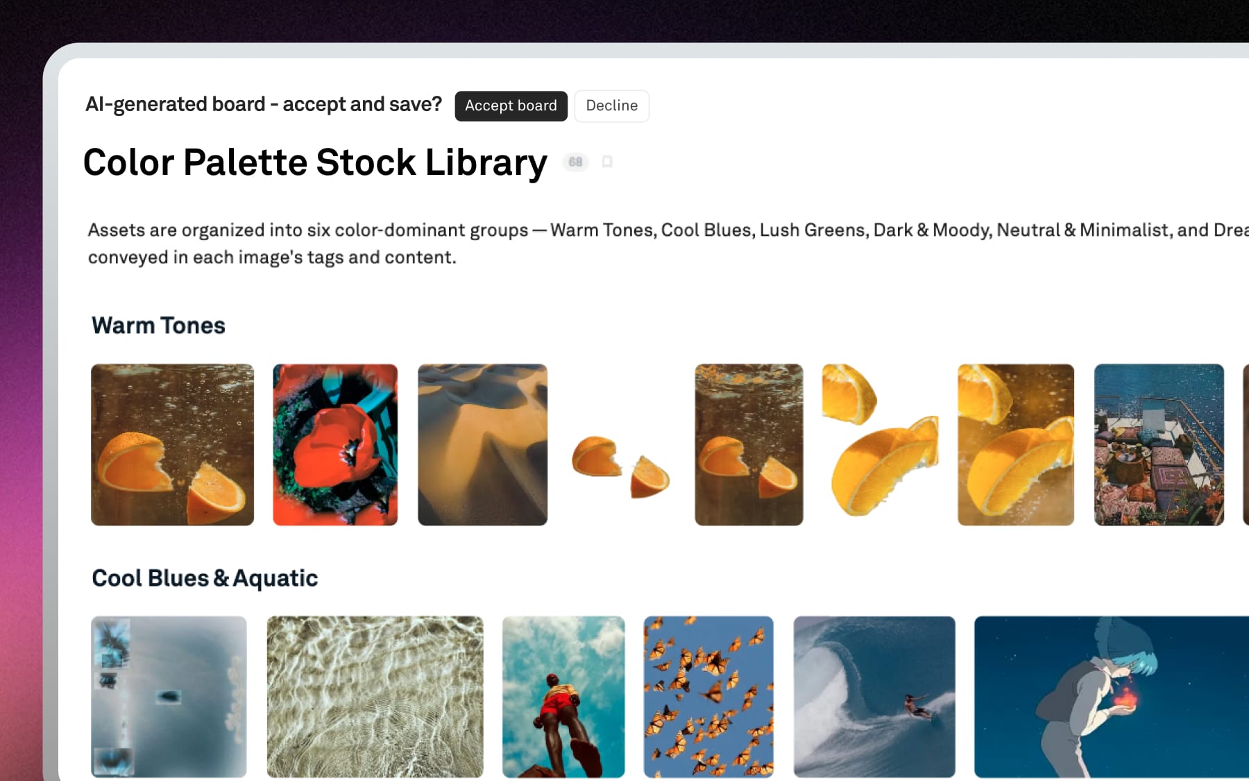 • Identify patterns (colors, styles, themes). “Identify similar color palettes across this collection”