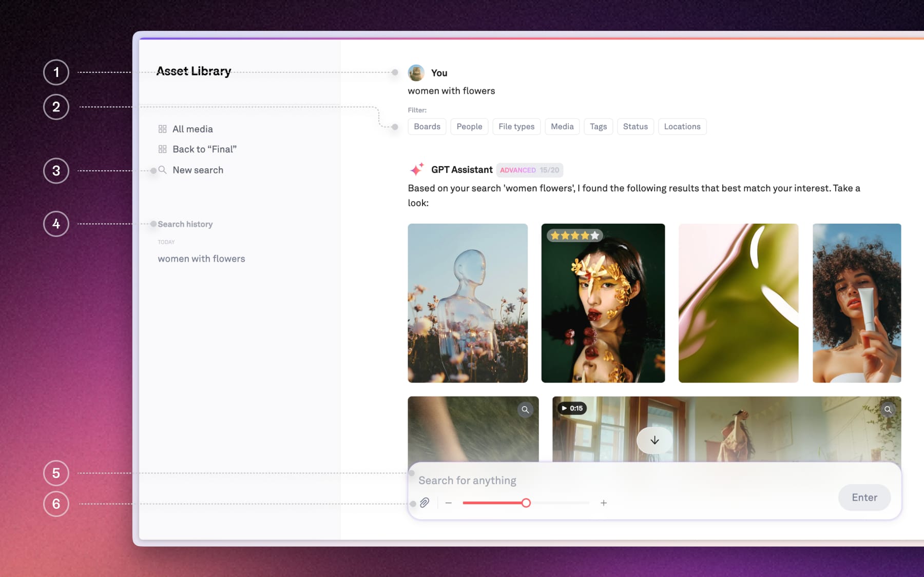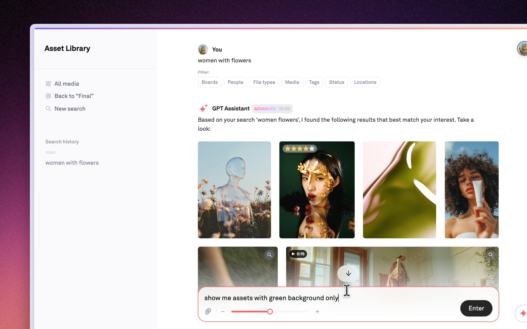 - Searching by "vibe": AI search also handles and interprets abstract or subjective requests, like "minimalist product shots," "moody lighting"