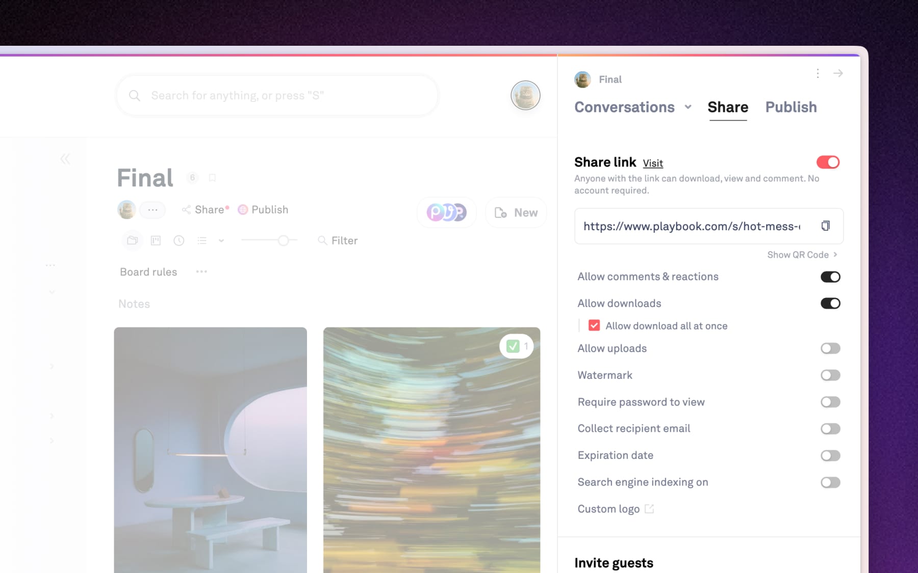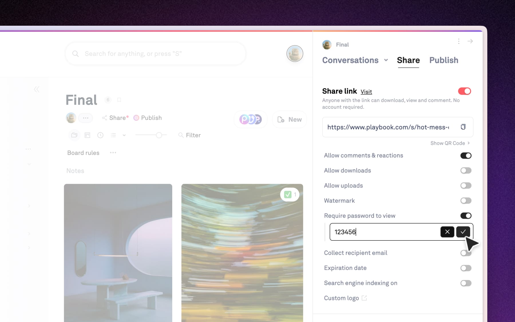 Learn how to manage downloads, set expirations and add extra protection to your shared boards.