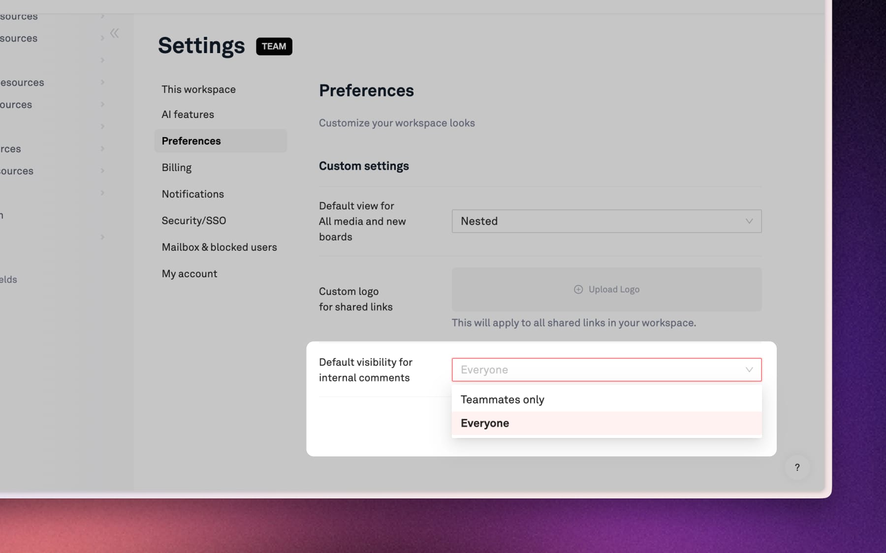 For workspaces on a Team plan, you can set who sees internal comments by default.