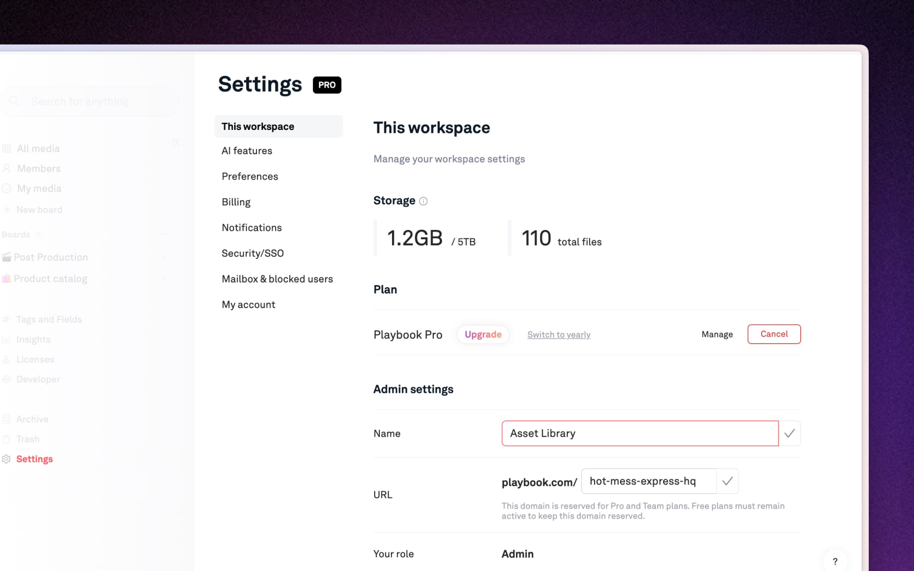Decide how your assets appear (Gallery, List, Kanban, Simple folder, or Timeline) by default when someone opens the workspace or creating a new board.