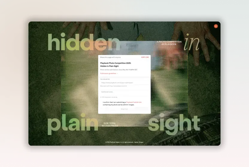 Get your work in front of 1M+ other photographers and creatives on Playbook. All submissions will also receive free access coupon codes to Playbook’s powerful suite of creative miniapp tools to supercharge your workflows.