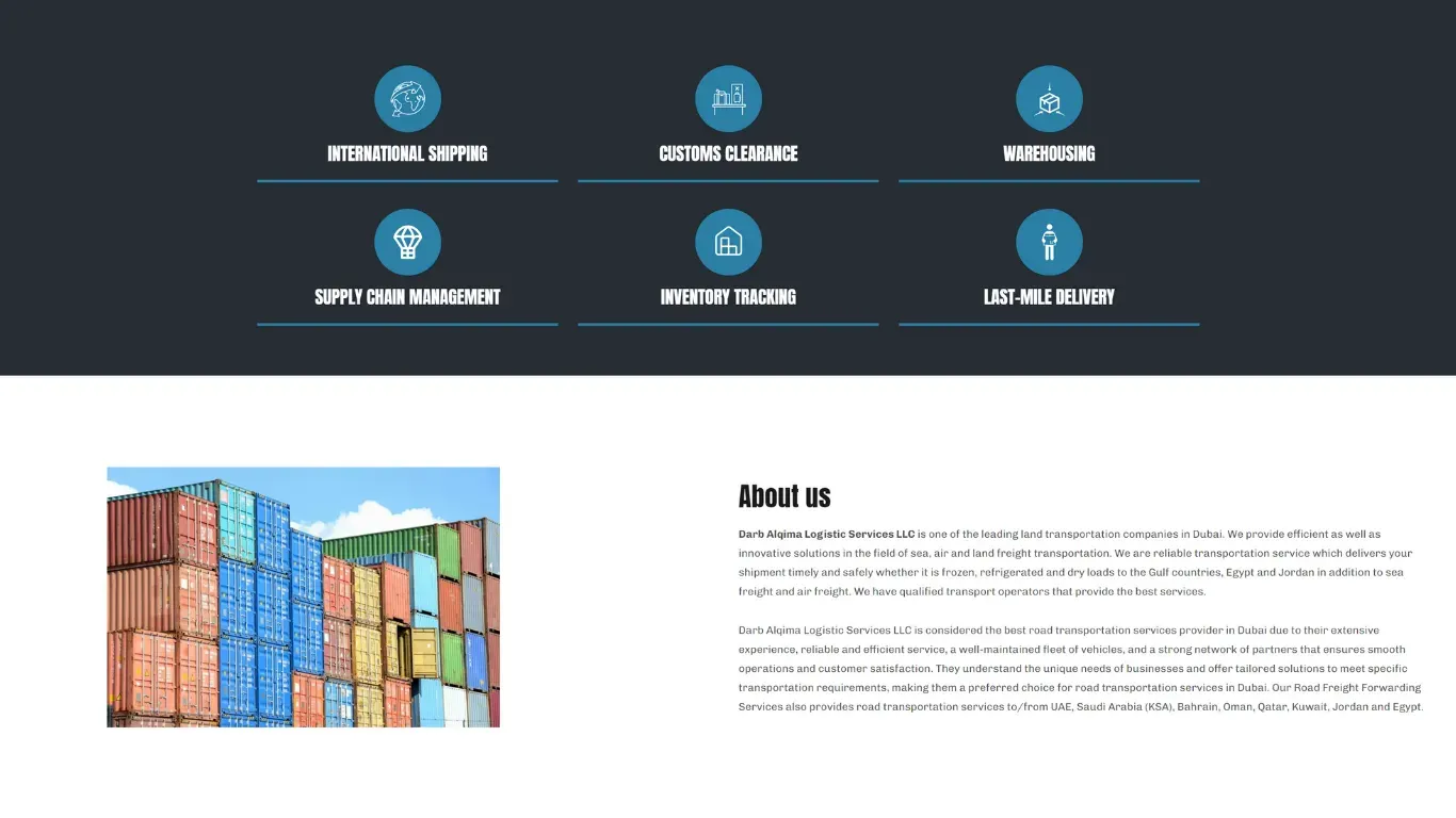 Darb Al Qima, a leading logistics company in the UAE. The website was designed to reflect Darb Al Qima's commitment to efficiency, reliability, and innovation in the logistics sector. With a user-friendly interface, responsive design, and visually engaging elements, the site highlights their core services and unique capabilities, enhancing their digital presence for clients and partners alike. The project was tailored to support Darb Al Qima's growth, ensuring seamless navigation and a modern look that reinforces their reputation in the UAE market.