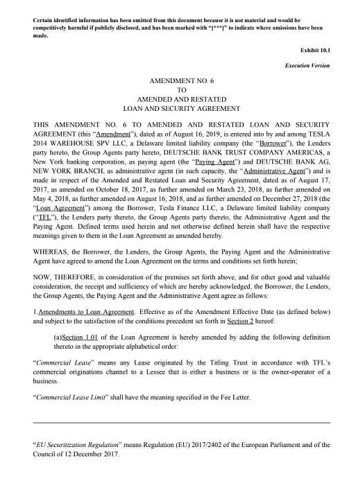 Law_Insider_tesla-inc_amendment-no-6-to-amended-and-restated-loan-and-security-agreement_Filed_29-10-2019_Contract