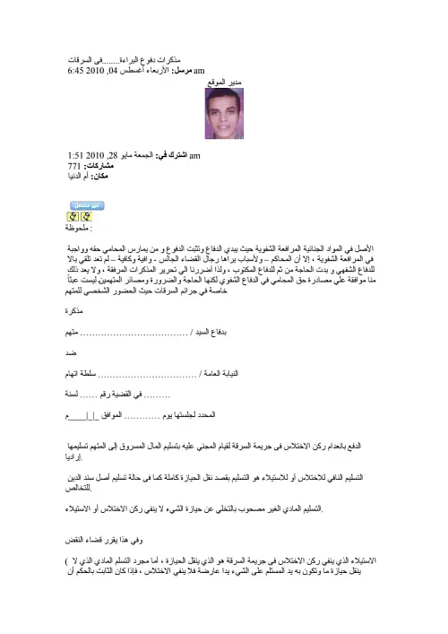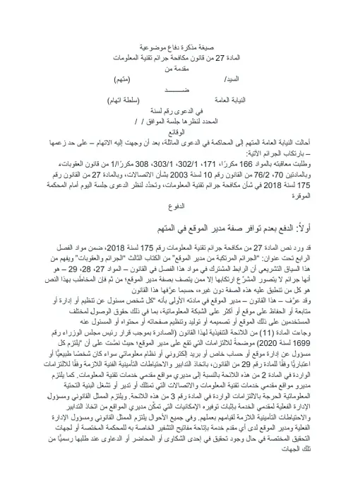 صيغة مذكرة دفاع موضوعية المادة 27 من قانون مكافحة جرائم تقنية المعلومات