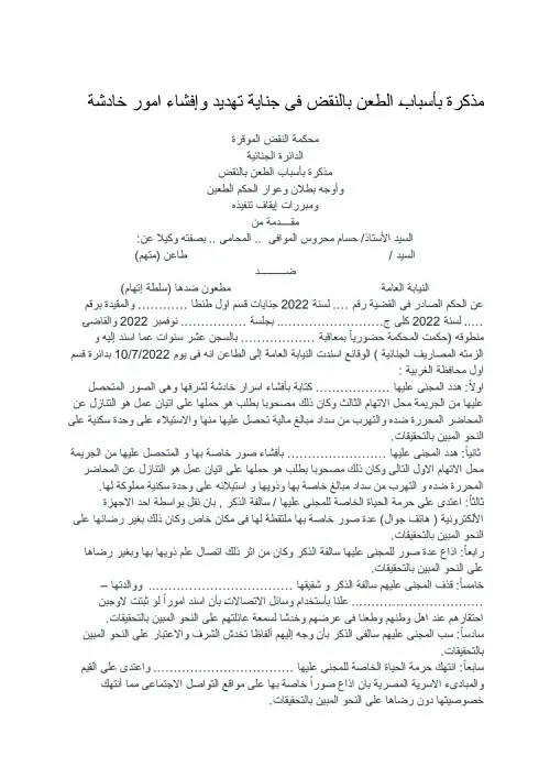 مذكرة بأسباب الطعن بالنقض فى جناية تهديد وإفشاء امور خادشة