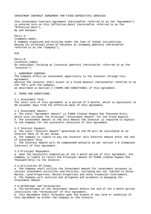 INVESTMENT CONTRACT AGREEMENT FOR FIXED DEPOSIT(FD) SERVICES
