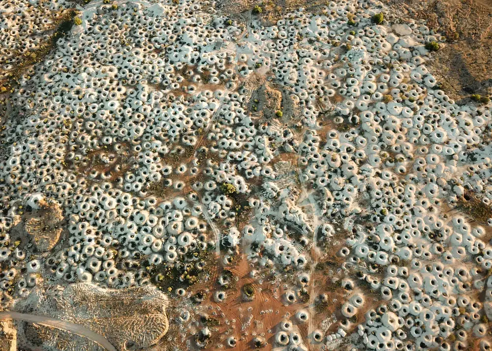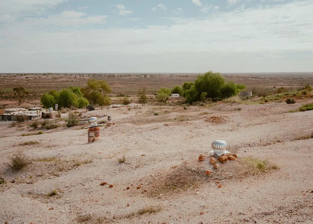 An aerial view of the area reveals a moonscape-like terrain, shaped by an estimated 50,000 opal mine shafts.
