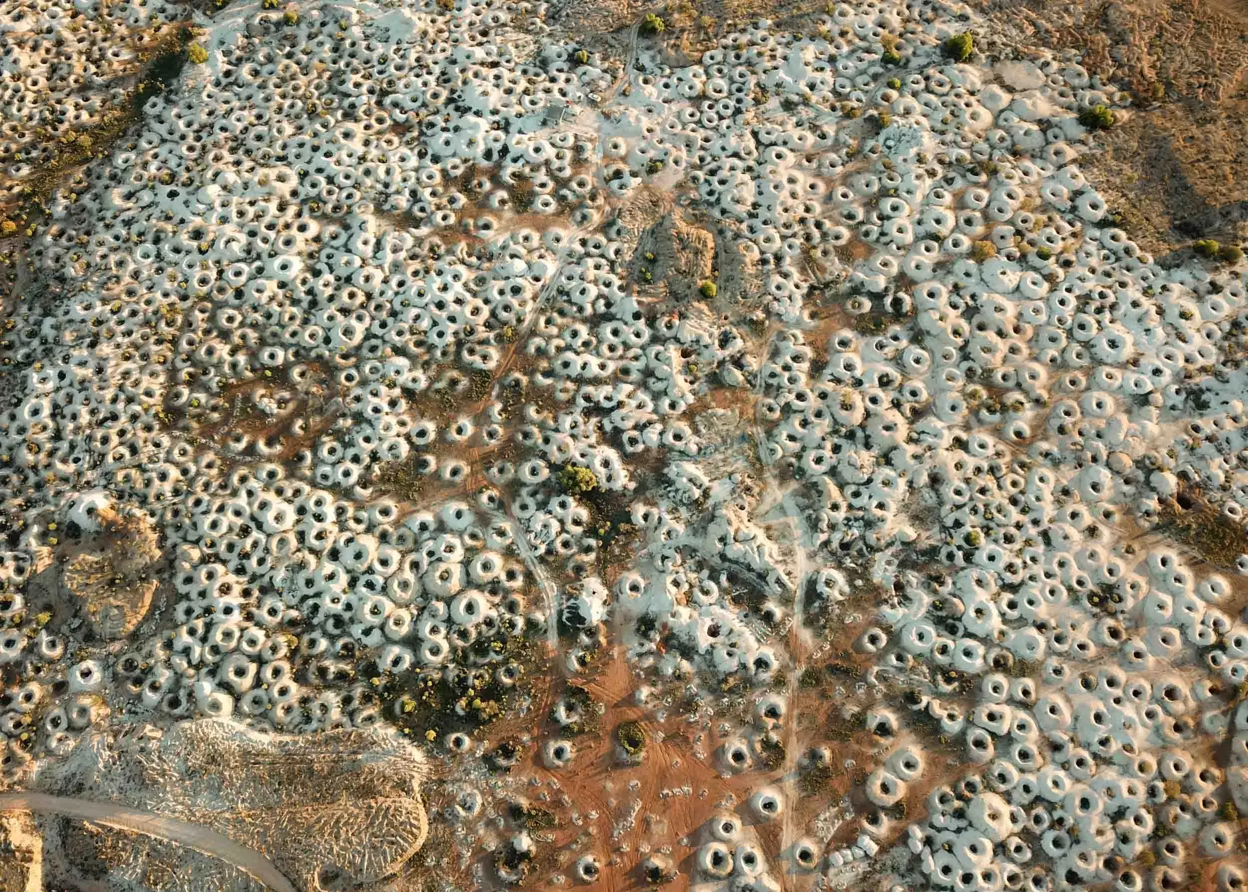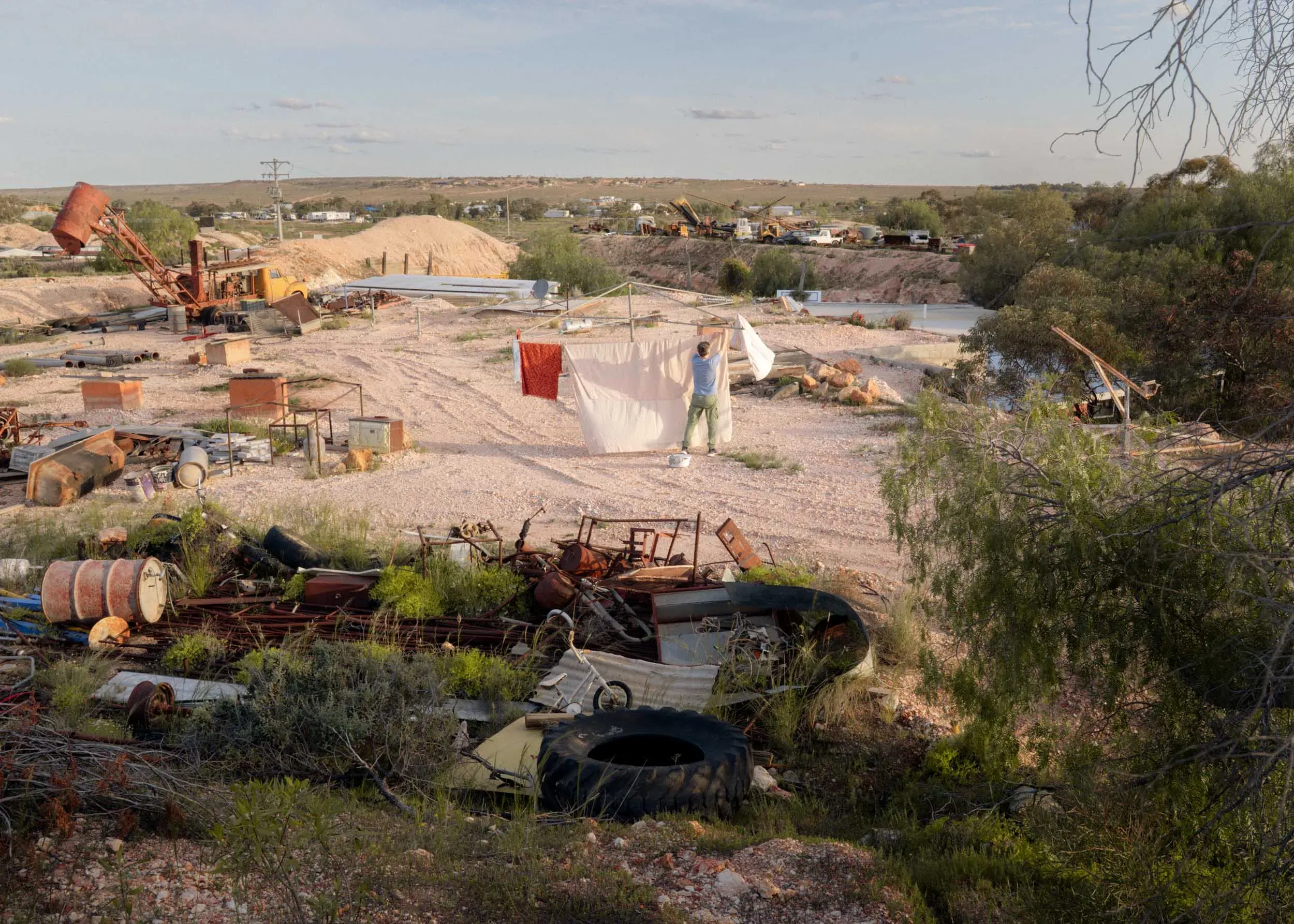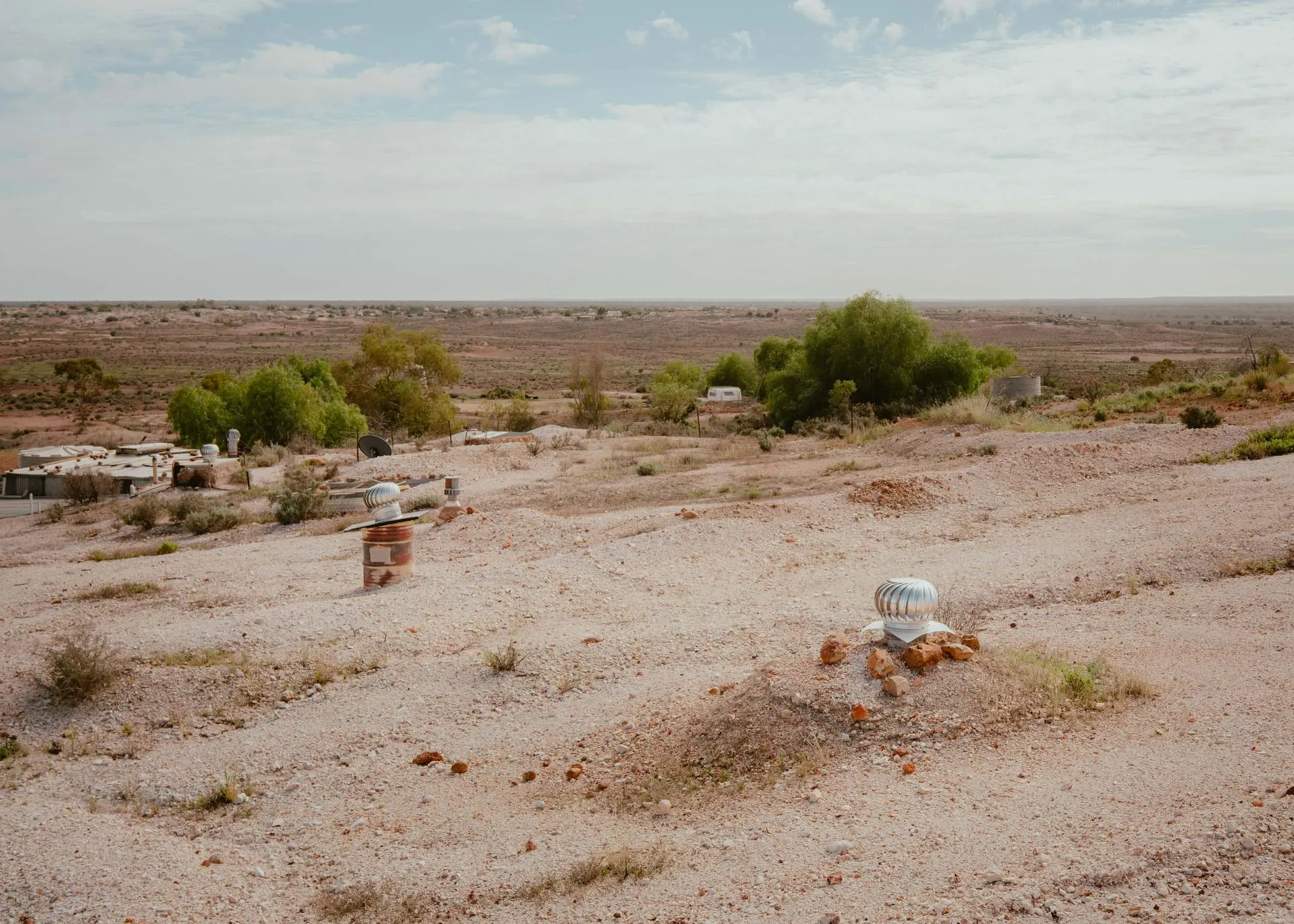 An aerial view of the area reveals a moonscape-like terrain, shaped by an estimated 50,000 opal mine shafts.